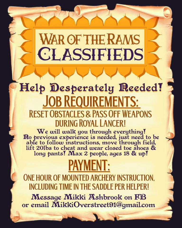 Equestrian: Equestrian has been desperately hurting for ground crew Someone needing to dismount to reset obstacles or pass off weapons really slows down our events. It also means someone isn’t getting to ride much at one of our 3-4 eq events a year. The Texas khanate (Michelle, Magnus, and myself, Mikki) will trade 1 hour of mounted archery instruction, including time in the saddle, to individuals who come ground crew during lancer No previous experience or equipment needed. We’ll walk you through everything. You just need to be able to follow instruction, move throughout the field, lift under 20lbs to chest level, and wear closed toe shoes/long pants